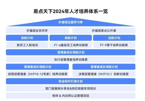 在企业持续乘风破浪,扬帆远航的同时,易点以创新发展的眼光看待每位员工的成长。在体系化人才培养方法下,作为负责任的雇主企业,易点天下尊重每位员工选择与更换岗位的自由,通过数字化转岗平台实施"HRBP咨询-直属领导面谈-跨部门评估"三级审核机制,实现岗位适配度提升、人才配置优化与组织效能提升的目标;公司将职位系统分为2大职位序列、3大职系、6大层级和20个标准等级,不论是管理型人才还是专业型人才,都能为员工量身定制职业发展道路,为每一位人才铺设晋升通道。